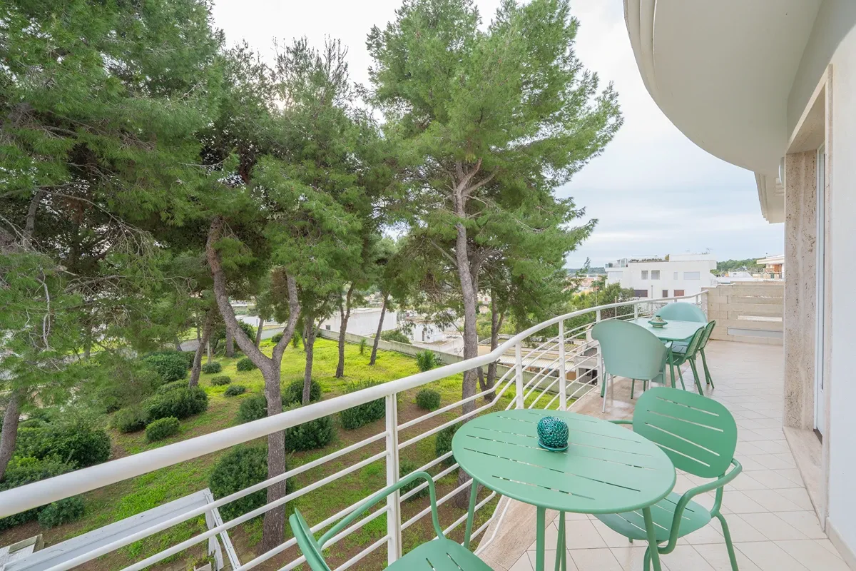 Entdecken Sie die Eleganz der Punta Palascia Wohnung, einer raffinierten Drei-Zimmer-Residenz, die bis zu sechs Gäste in einem voll möblierten Ambiente beherbergt. Die Immobilie verfügt über einen gut ausgestatteten Balkon, von dem aus Sie einen üppigen Pinienhain und am entfernten Ende einen faszinierenden Blick auf das Meer genießen können.